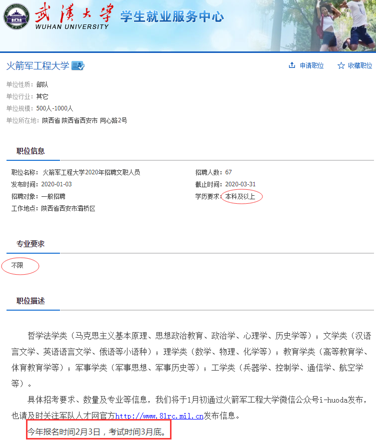 由上可知:2020年軍隊文職考試,火箭軍工程大學計劃招錄67人,本科及以上學歷可報,不限專業(yè)。按照往年報名時間推理,如果年前不發(fā)布公告,2020年軍隊文職考試可能會在1月31日發(fā)布公告,建議大家要多多關注本站,公告發(fā)布后本站會立即更新。