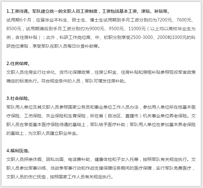 而且福利待遇趕超公務員和事業(yè)單位,在11月份,中國人民解放軍軍事科學院軍事科學信息研究中心2020軍隊文職人員招錄宣講會上就有詳細介紹。如下圖: